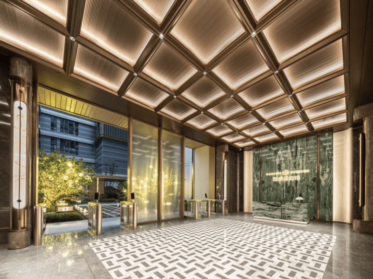 电梯古铜色不锈钢到顶,轿厢内装饰的奢石岩板,与公区一脉相承,形成统一的视觉美感。