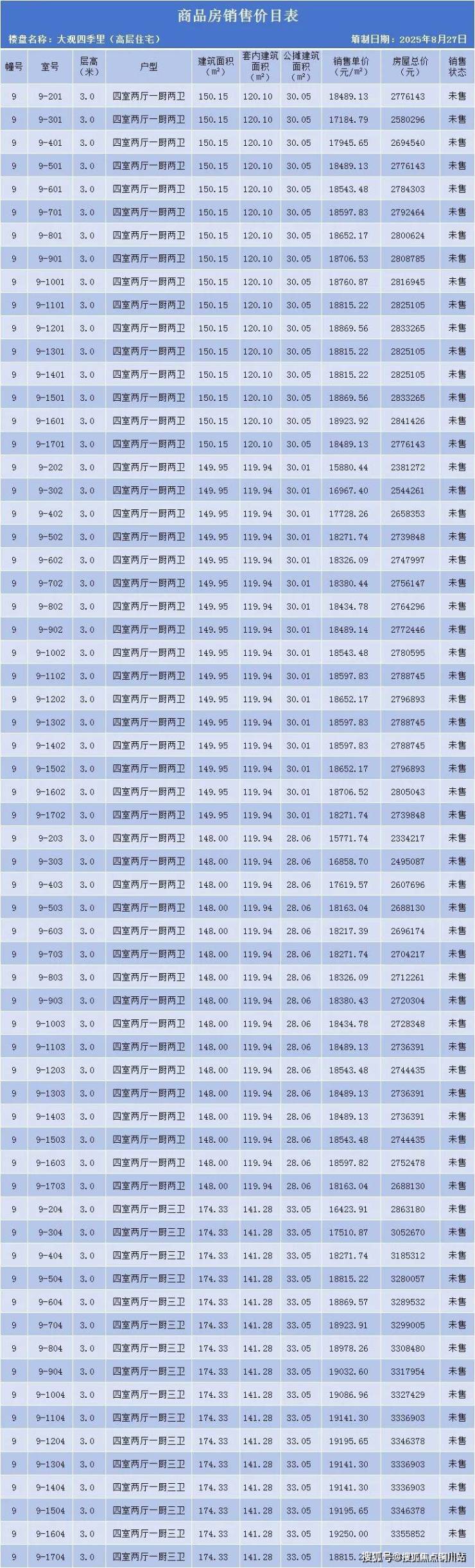 本表报送住宅房源总套数161套,总面积23535.07㎡,总价429842983元,均单价18263.93元/㎡。