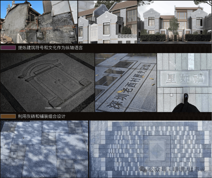 街坊设计:在复建行列式街坊的同时,通过优化巷弄高宽尺度提升了低层住宅的空间品质。红瓦与青砖以及不同色泽的石材等材料交替运用,在屋面和立面上营造出群落尺度的参差变化。各种形式的门头式样、山花纹样与文字元素营造了丰富的空间观感。设计同时通过考究的拼花处理、砖砌节奏与砖缝变化寻求多样感受,延续了里弄空间自然而丰富多样的特质。
