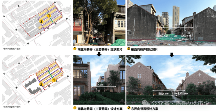 项目设计方案尊重原风貌建筑肌理,保留了行列式布局和南北院落的肌理特征,仅将西侧原单独布局的庆云坊织补在了地块东侧的空地上,但仍然保留了局部退让作为次入口。巷弄尺度与等级关系遵照原历史风貌进行还原。