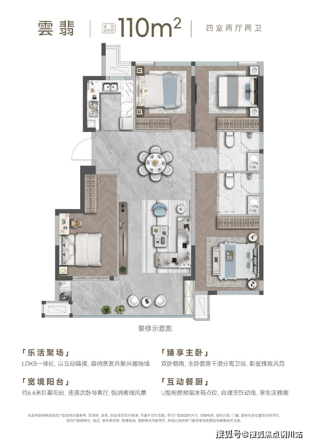得房率高达97%:通过飘窗全赠送、阳台半赠送等设计,110㎡户型实得面积超106㎡,相当于市面130㎡产品,性价比突出。