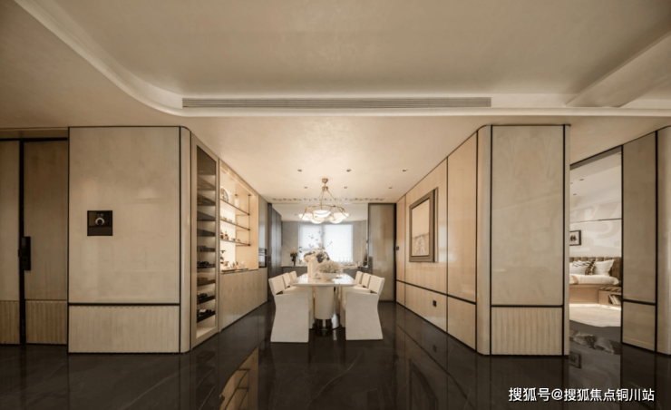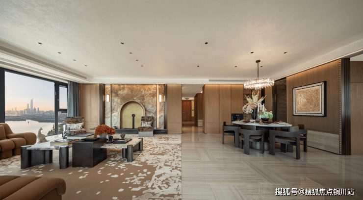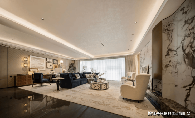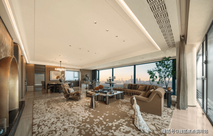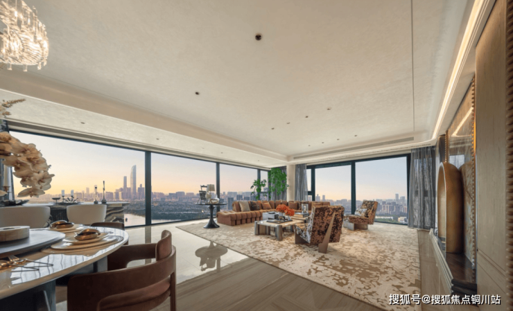 7米环幕客厅:270° 环幕边厅搭配 900*1800 的地面岩板大砖,十分开阔敞亮,电动窗帘电机和轨道全部为交付标准。