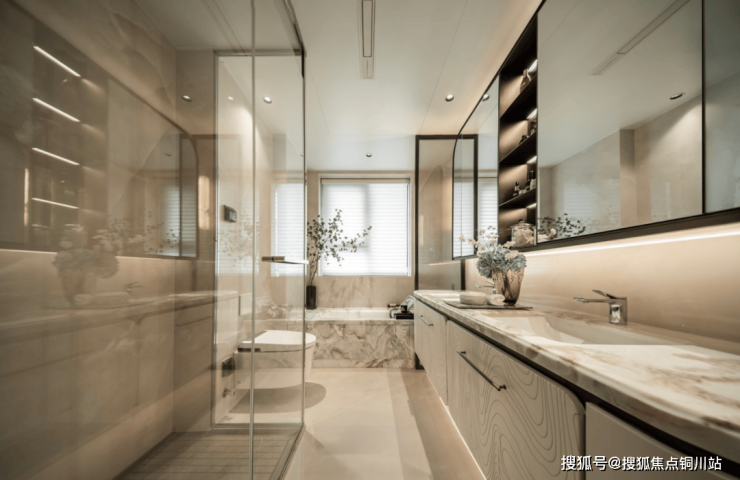 客厅:南向开间约6.75米,900×1800mm木纹石拼花大砖通铺,改造为横厅(打通南次卧),形成超大社交/影音空间。|非最终交付标准主卧套房:独立衣帽间,分区收纳 + 独立梳妆台,双台盆,嵌入式浴缸 + 独立淋浴房,智能马桶预埋电位。