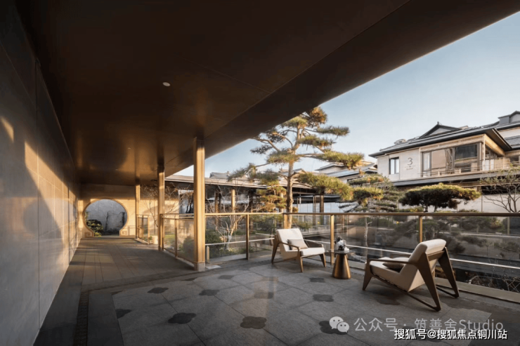 借鉴了名园造园的手法,将江南园林中的庭、廊、桥、坡、台都搬了进来。清溪绕石潺潺流,漾开一池清幽。琼台赏月,浅椅两张,圆几一张,静待君坐。闲坐于此,清风拂过,带来草木清香,听水声潺潺,赏景致怡人,心在此间寻得悠然安宁。