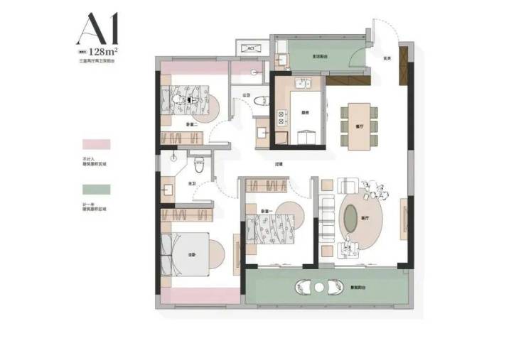 其中128㎡不仅做到大三房居住体验,还在入口玄关处多赠送一个生活阳台,大大提高了使用空间,还做到了真正的南北通透!