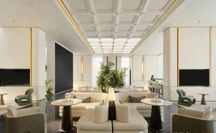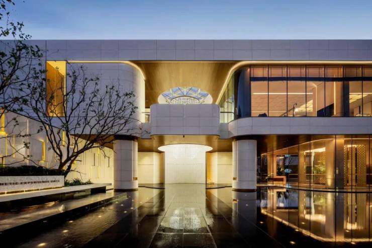 顶部则采用约5米的净空挑檐,搭配复古风格的做旧铝板吊顶,营造出一种庄重而热烈的入口仪式感,为归家之路增添了一份尊崇与礼遇。