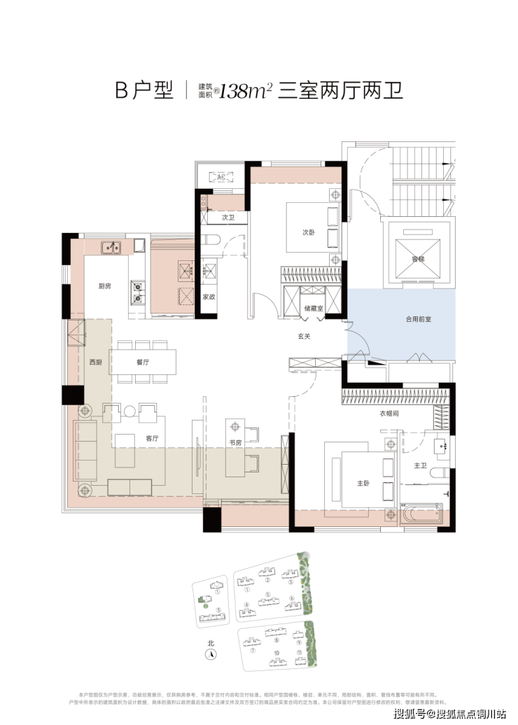 138㎡户型是2号楼的西边户,采用2+X设计,三开间朝南,南向14米大面宽。