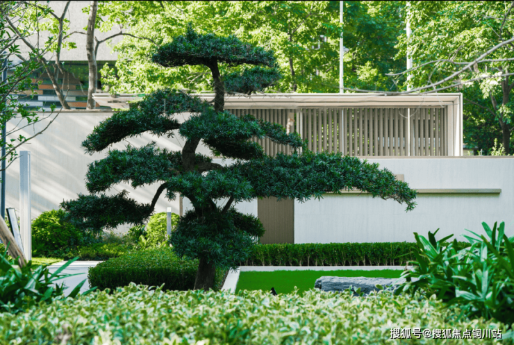 ➤二进迎宾步道,第一眼便被造型别致的罗汉松所吸引,罗汉松因其树形古雅,神韵清雅挺拔,自有一股雄浑苍劲的傲人气势,而成为豪宅社区标配的树种之一。