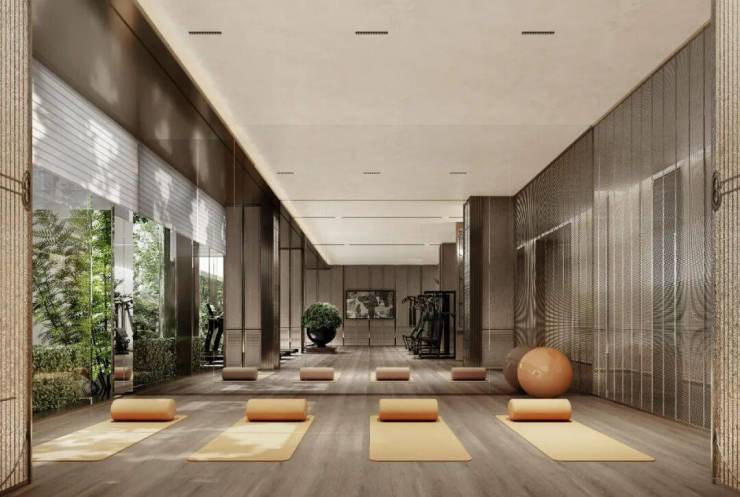 架空层业主会所内,设置了健身区、书吧、水吧、私宴厅、影音室、瑜伽区、儿童游乐区、小型高尔夫练习场、台球活动室、泳池等活动空间。