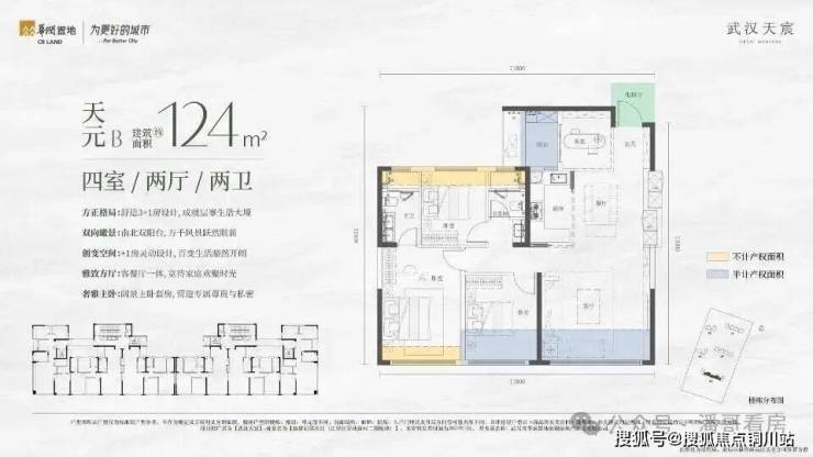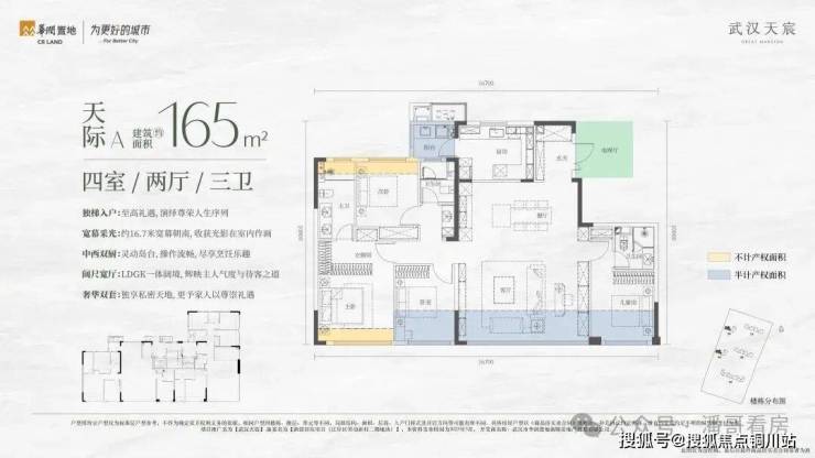 2、4号楼小高层里面是建面约165平左右的户型,也有两种结构,一个是南北朝向的南向大开间户型,做了南向双套房。因为本身公摊更低,加上拓展面积,165平户型得房率可以达到约100%,标准的负公摊。