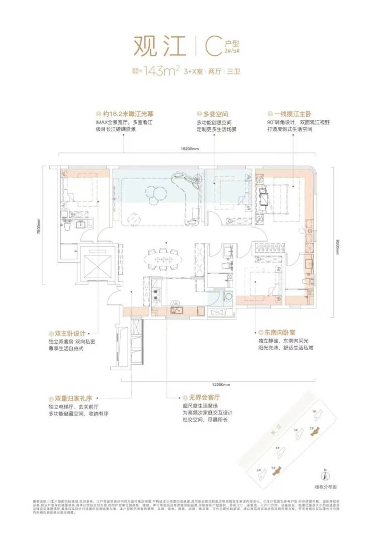 建面约143㎡户型面宽罕见做到了约16.2米,形成IMAX巨幕观江面。