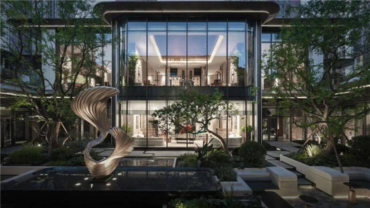 这些空间全部在负一层,以围合式布局,环绕下沉式中庭景观而建,并采用大面积玻璃景墙。