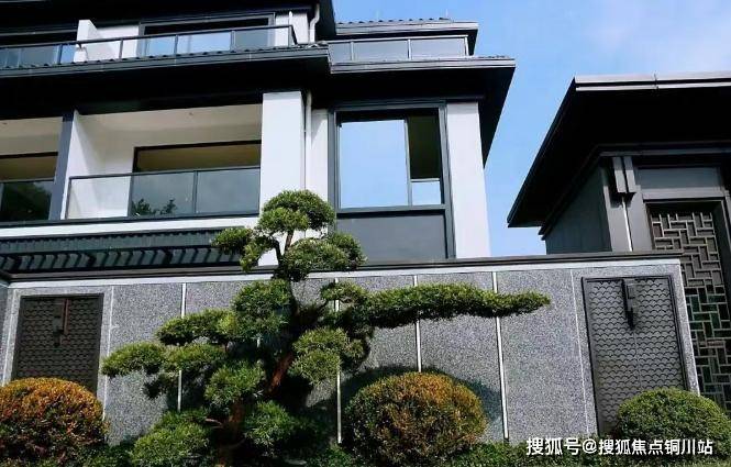 建筑风格:新中式美学与现代工艺结合,深灰色石材干挂外立面搭配珍珠白真石漆,屋顶采用荣冠西瓦,通过对称秩序与简化线脚营造典雅质感