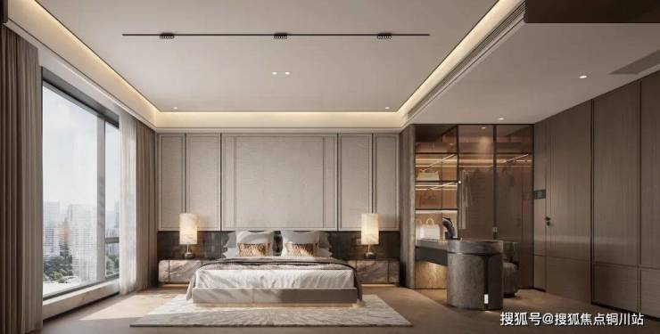 主卧套房270度转角落地窗,采光视野更好。主卧3.8米面宽 (同级户型主卧面宽多为3.4米) 、超大尺度步入式衣帽间、独立浴缸,主卧阳台优化面积后,舒适度与200平大平层的主卧相当。主卧门口单独配置收纳储物室,是此户型的一大创新。