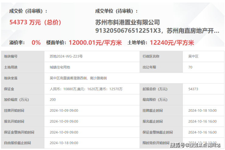 2023年10月18日,斜港置业&甪直房地产以底价5.44亿元竞得项目地块,成交楼面价12000元/平。