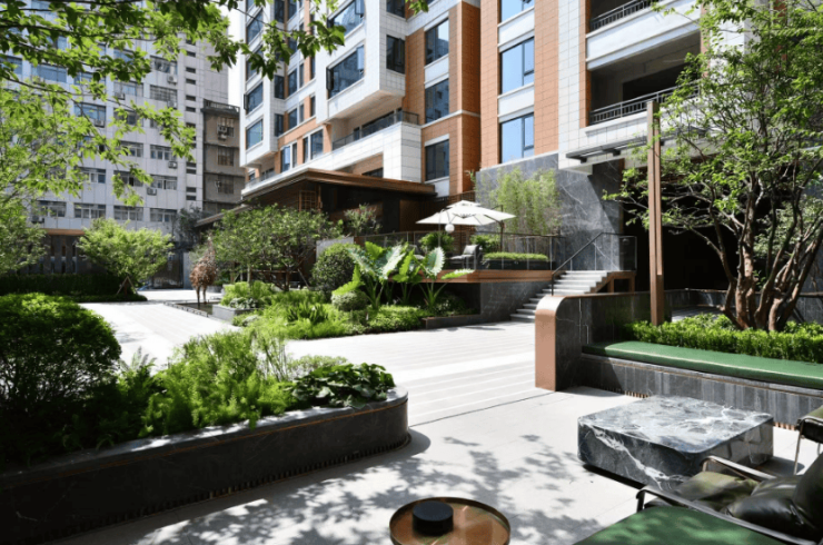 在植物配置上,项目团队精心挑选了丰富的植物种类,巧妙搭配出四季不同的色彩与景致。小小一方天地,春季繁花似锦,夏季绿树成荫,秋季层林尽染,冬季松柏常青,让居者在四季的流转中,感受生命的律动与自然的美好。水景的巧妙融入,更是为这片静谧之地增添了灵动的气息。潺潺流水声不仅消除了城市的喧嚣,还与周边的绿植、座椅等元素相互融合,形成了一个微生态景观系统,调节了局部气候,增加了空气湿度,为居民提供了一个舒适宜人的户外环境。