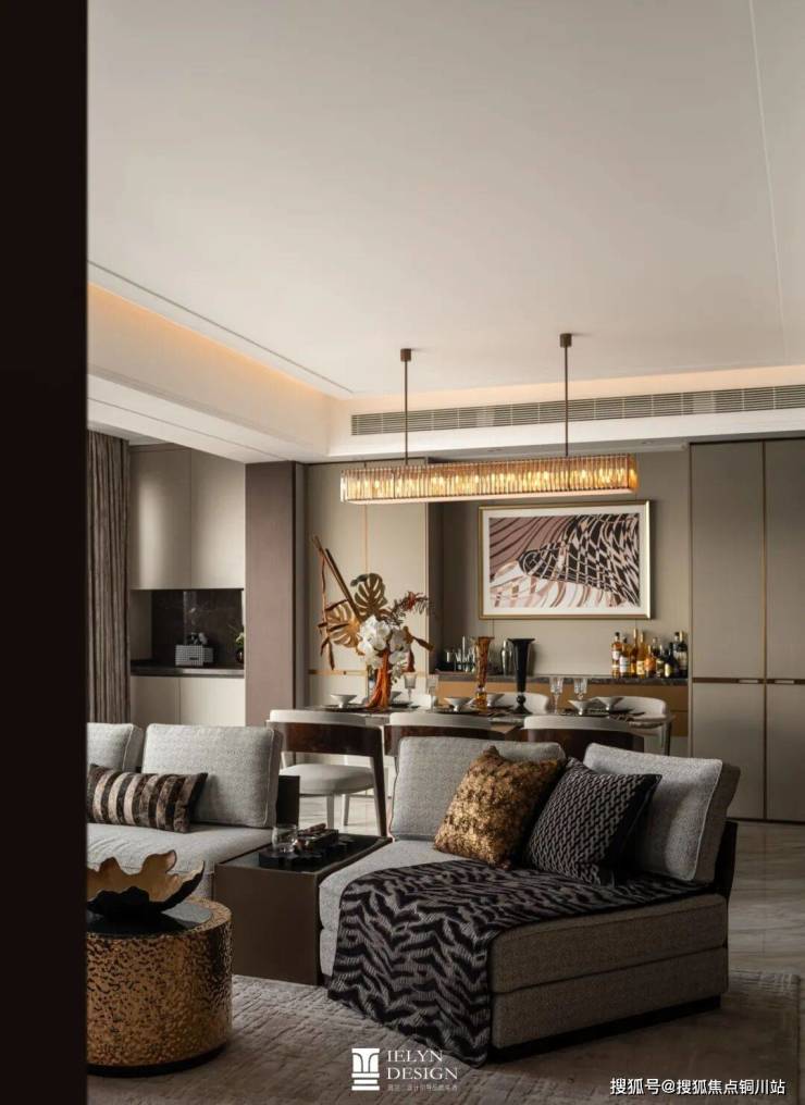 大面积落地窗下的自然光景与空间中的布艺、石材与金属相得益彰。运用色彩点缀琥珀橙进行搭配与过渡,全开放式无遮挡的空间,营造了丰富的视觉效果,赋予空间更强的层次感,使空间更具张力。
