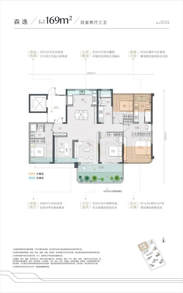 建面约169㎡四房两厅三卫,高阶家庭之选。得房率高达105%,约20㎡空中花园联动客厅、餐厅、厨房、阳台打造出总面积约80㎡的LDKBG一体化动区——这相当于在普通户型中硬核“植入”了一个小型会客厅+咖啡馆+家庭厅的复合场域。