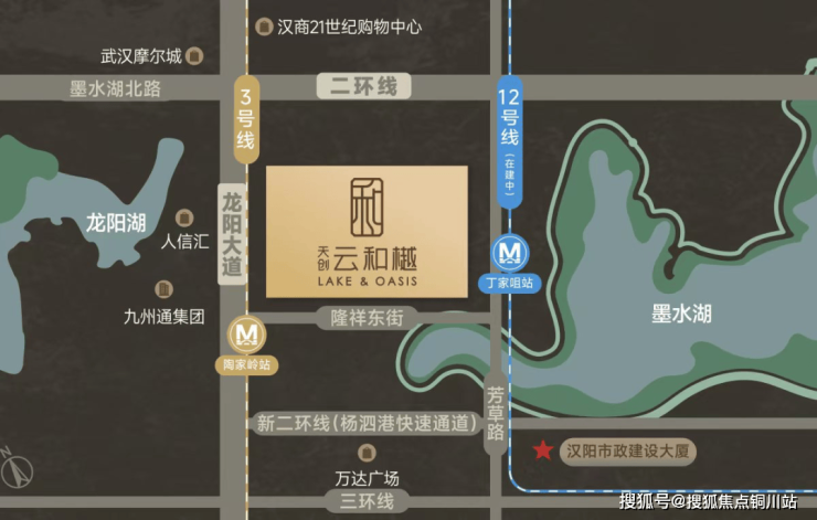 另一条是地铁12号线,是武汉地铁的首条环线,串联了武汉三镇,连接了汉口火车站、二七滨江商务区、武昌火车站、王家墩中央商务区、园博园等。项目距离12号线丁家咀站约800m左右,目前正在建设,预计25年年底开通,远早于项目首批交付时间。