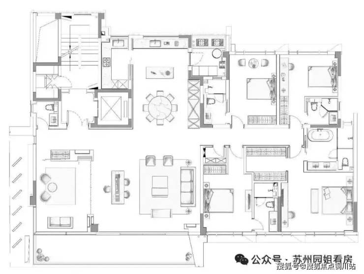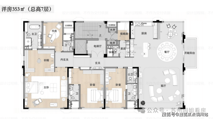 约353㎡,入户双开门,5房6卫,连保姆房都是套房设计;动静分区,其中超级公区带开敞阳台。