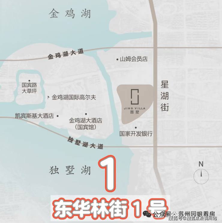北侧直面金鸡湖,出门即地铁5号线,周边被国宾一号、铜雀台等10万+豪宅环伺,完全演绎“出则繁华、入则宁静”。