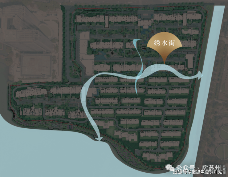 社区内部,数百米中心水街贯穿,分隔平层与别墅区。