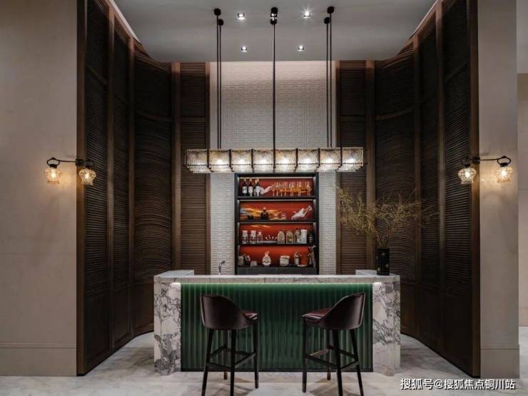 地面采用木石嵌拼技术,每一片材质皆经毫米级精准裁切,于严谨中见自由;首个法式华夫格悬浮天花,重现艺术复兴时代的艺术美学,更通过光线与方格交融,营造人文、高贵、优雅的室内氛围;