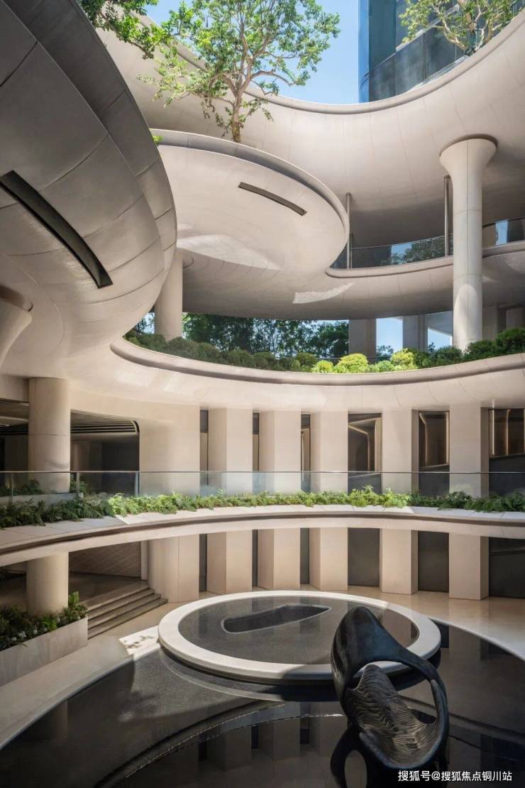 云梦大泽的立体森境,以美术馆的营造思维进行场景布置,让潺潺的流水从天而降,2楼纯架空的高线花园设计,将绿色引入到空中,形成多层次的景观。后场庭院引江入园,让居者可以私享长江的设计活力。