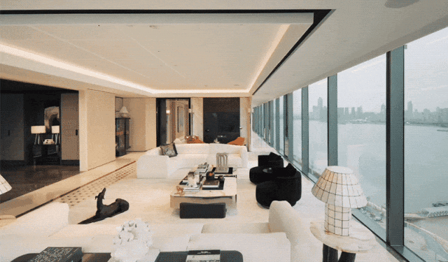 设计师以无柱式的设计语言来处理会客厅转角空间,让居者收获不间断的270度观江视野。晨间江面的细碎金箔、午后的微澜壮阔,以及傍晚时分的彩霞飞舞……