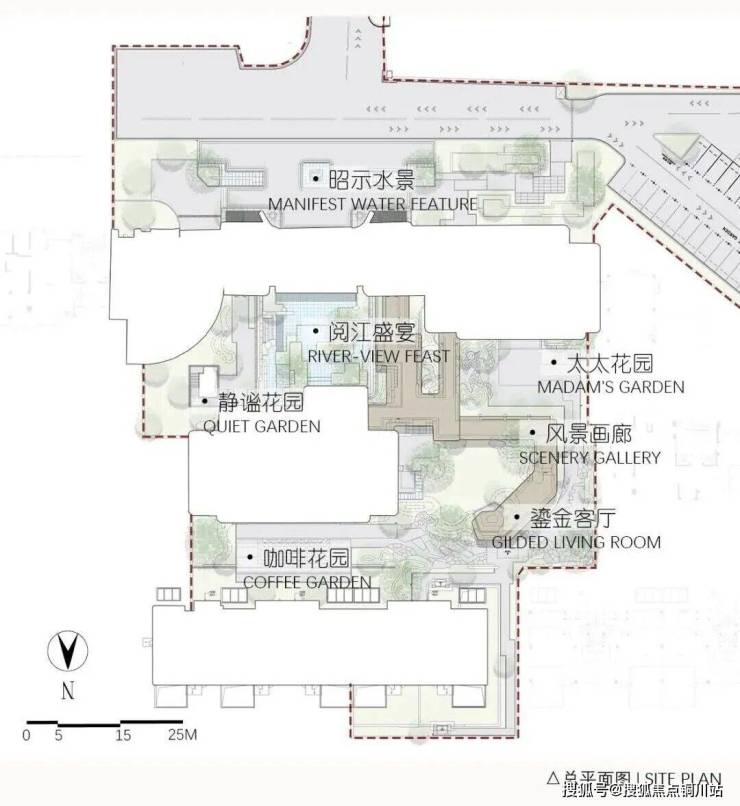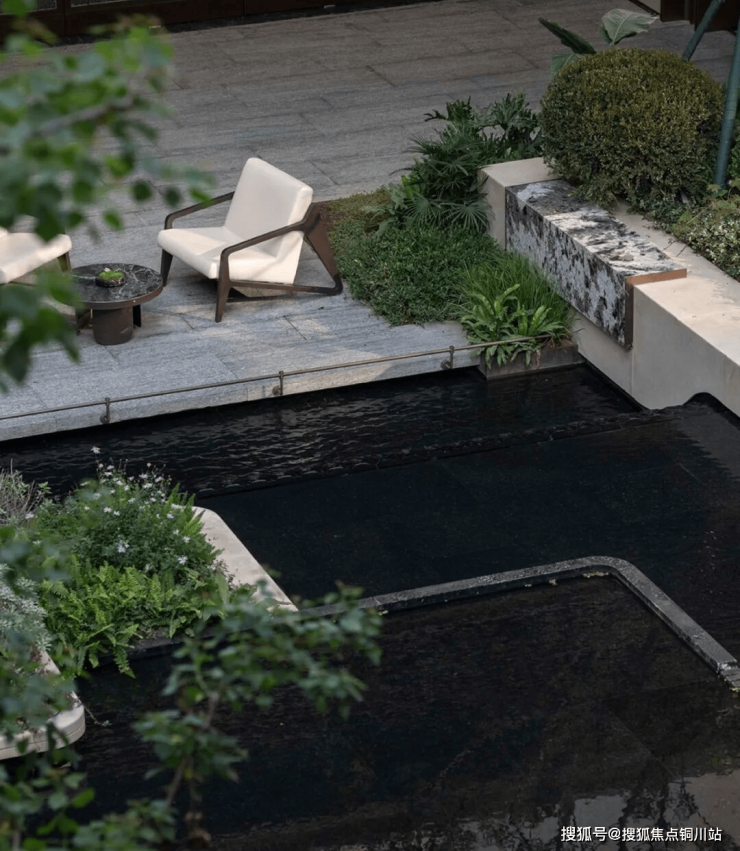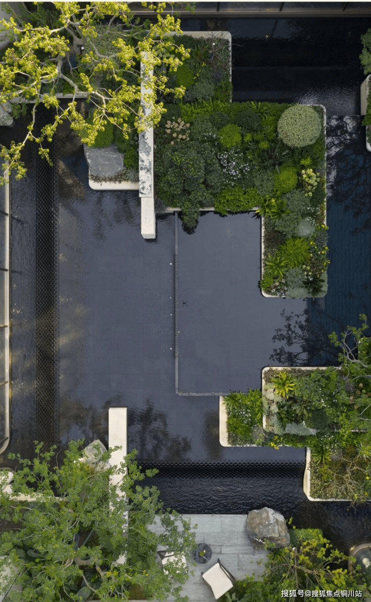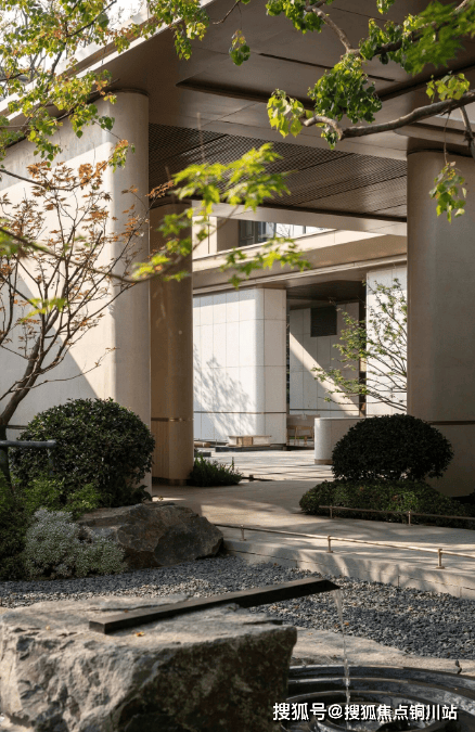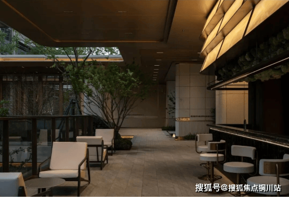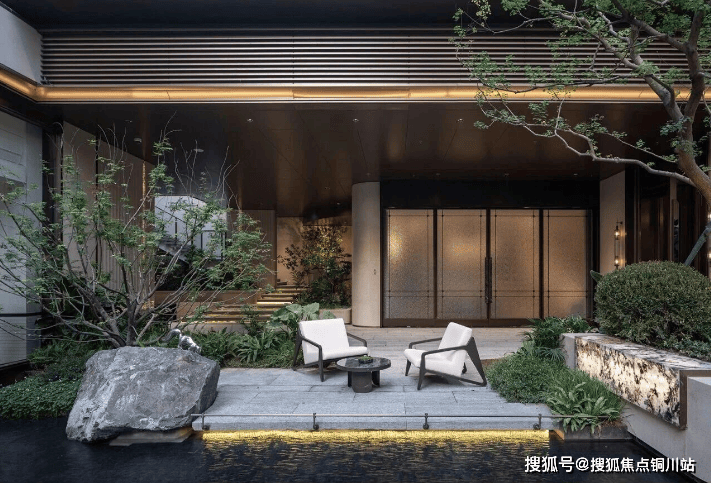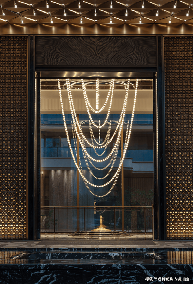 穿过气派的门头,超10米高差叠水飞瀑纵贯上下,恢弘而又独具特色,让视线自然过渡到独立会所。这一下沉式社交空间与入口景观形成巧妙呼应,完美阐述了“内外兼修”的设计哲学。