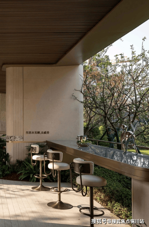 与檐下空间相呼应,室内外以一体化设计打造日咖夜酒高定吧台。日间,手冲咖啡的香气漫过檐角入夜,灯带勾勒出吧台流畅的线条,摩登精奢的氛围扑面而来。