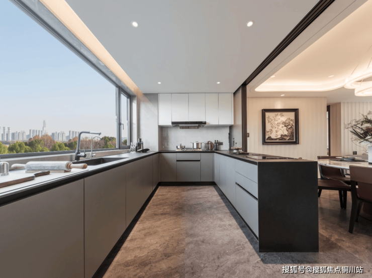 6米开间的奢阔客厅与约4.9米的进深,营造出超过29平方米的恢弘厅堂,结合LDKB(客厅、餐厅、厨房、阳台)一体化相连的设计,餐客厨相连面积约72㎡,空间可自由组合变幻,既能满足家庭日常起居,亦能从容应对高端社交聚会。