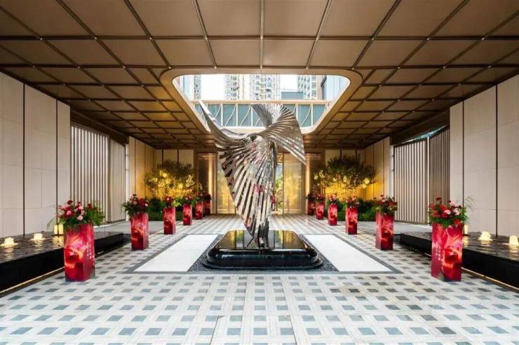 红毯铺陈归程,繁花缀饰门庭。从解放大道步入小区,迎接他们的是高级大气的社区大堂。具有艺术感的雕塑,奢石背景墙,地面拼花石材……审美在线,用材考究,大堂媲美星级酒店。