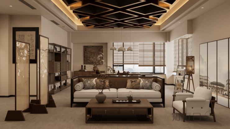 项目地标于舟山临城财富君庭酒店,地处繁华的商圈中央地段。设计团队以"和院"为命题,将中式哲思凝练于空间叙事。以"隐于繁华,归于和境"为核心理念,通过解构传统古建符号,融合现代设计语言,在室内构建起当代东方雅茗场所。