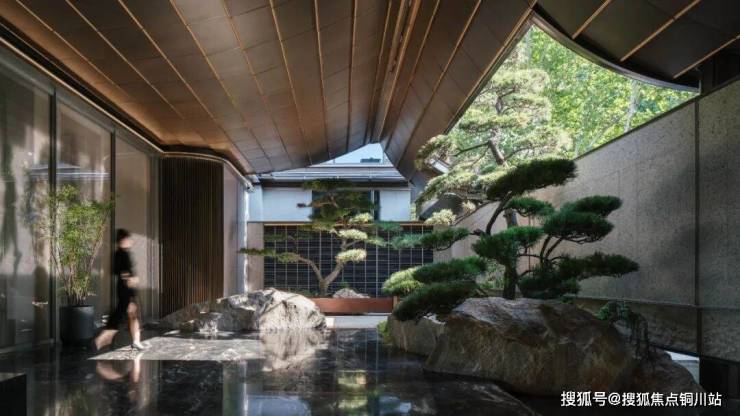 为此,立体庭院布局以中央水体为核心,建筑体量环抱形成向心秩序,有效强化了场域的凝聚力。游步穿行间,巨幅玻璃借现代框景手法,将外部景致抽象为动态立轴,通过尺度对比与光线渗透构建多重叙事。这一策略延续了宋式园林注重精神性与自然交流的美学,在狭小用地中拓展出幽深静谧、虚实相生的意境体验。