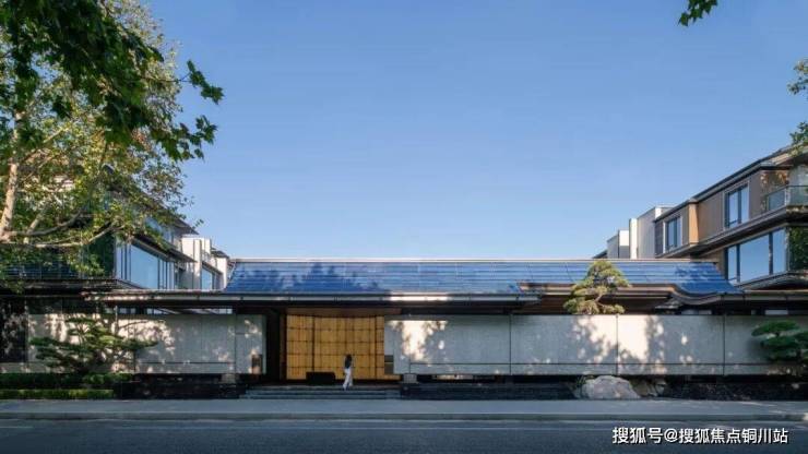 在鸟瞰视野下,主入口刻意退离城市干道,以“大隐于市”为策略,规避喧嚣,塑造藏匿感。通过设置宽约60米的横向界面,强化视觉识别性与礼制秩序。为打破连续界面的单调,植入非对称景墙与迂回路径,延缓行进节奏,重构心理仪式维度。台基高度经精确控制,并融汇山石、流水、青松等元素,以现代笔法勾勒出一幅可游可感的“实景山水”,完成“实—虚—实”的空间转换,引导人在此停顿、观想。