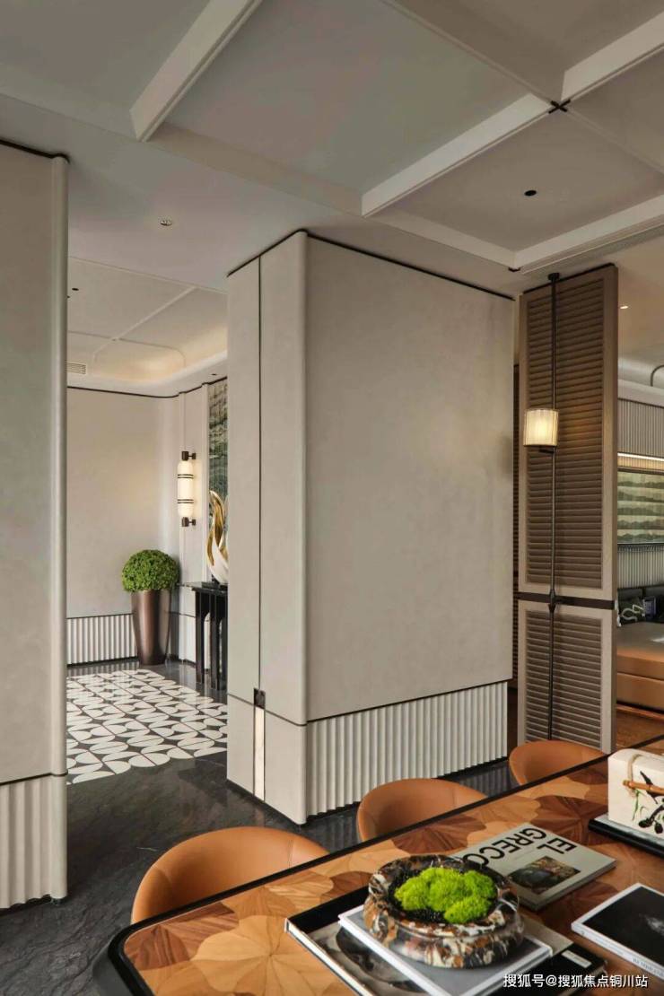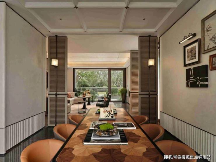 “竹影茶廊” 取意苏州园林的漏景之妙,以竹为屏、以光为笔,勾勒出“月映竹成千个字”的静谧画境。翠竹摇曳,茶香袅袅,为人们提供了一个静谧悠然的品茗畅谈之所。暖棕色拼花台面搭配皮制座椅,彰显贵气与奢华。