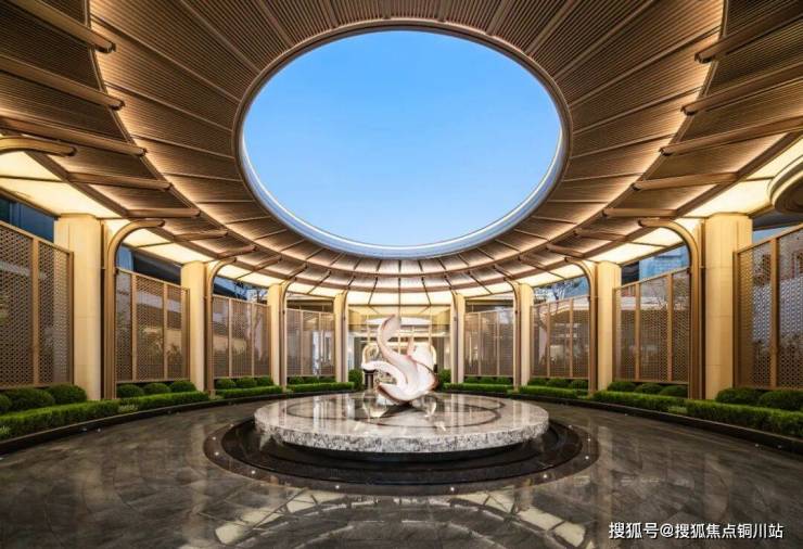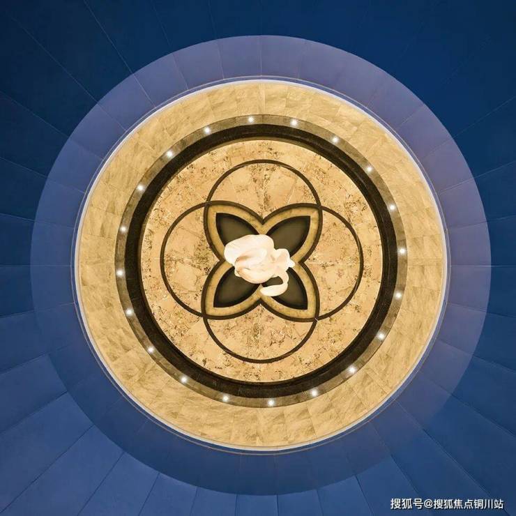 潘多拉透光奢石水台,定制海棠水景雕塑座立中央。天光从圆形天窗挥洒而下,仿佛花瓣盛开水景之上。圆厅以石材与铝板拼接,工艺繁复,精妙呈现。点缀发光奢石阳刻花纹,托举“花好月圆” 意境。
