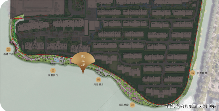 项目依循约750米三面临水的场地特征,创造出一片独立于都会的绿洲、并打造约450米长的鸣凤堤景观水系。