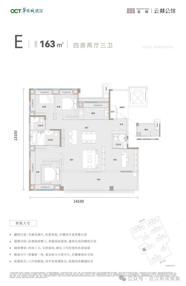 红坊丨云囍公馆,作为武汉首个四代纯低密摩登洋房,打造建面约120-169m²四代洋房,以超高得房率的新一代标准,为全武汉启幕摩登生活新向往。