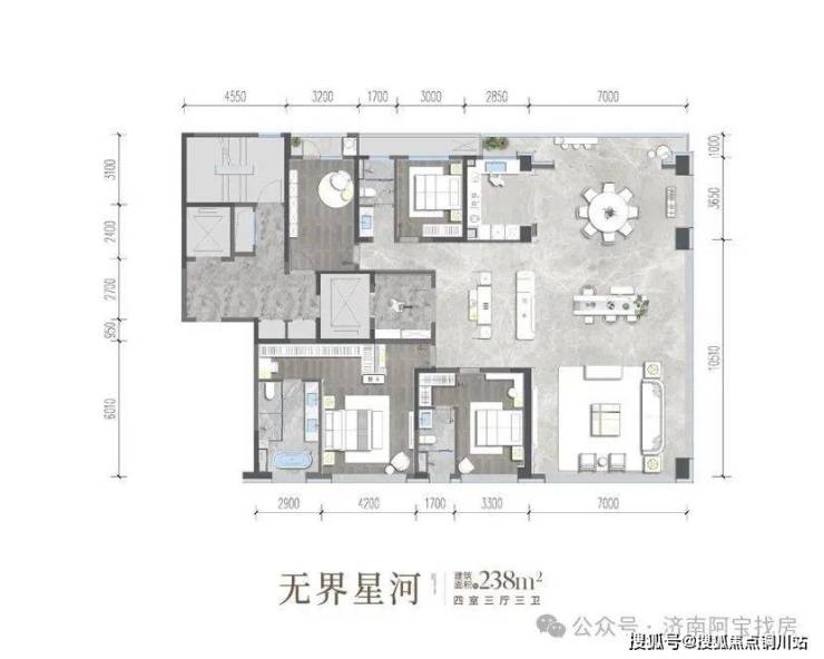 建面约238㎡| 无界星河| 四室三厅三卫私享约7㎡艺术电梯前厅+双玄关,双动线归家系统,中西厨+岛台洄游动线北向约9m生活阳台,约40㎡总统级套房主卧,三分离卫浴&独立衣帽间,搭配约3.2m全景落地窗,约100%私享率,LDKG一体化设计,东向约11.5m落地观景窗&南向约7m奢阔开间,270°IMAX环幕视野