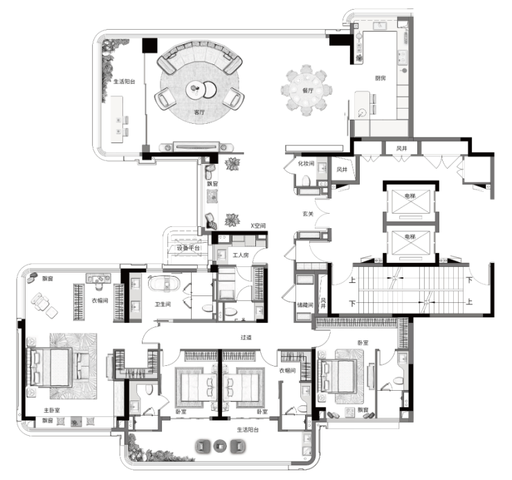 至于建面约385㎡的户型,北向约17.6m宽景观面,南向约22m面宽,约3.45m层高,窗墙比最高达到约0.53的奢制;建面约69㎡奢华客餐厅更是可以容纳16-18人的家族派对;会客厅旁,还设置了“X”灵动空间,配备约4.8m宽的独立飘窗,完全可以打造成艺术客厅、休憩剧场、咖啡屋……家人在客厅看电视,自己可以在“X”空间喝咖啡、练瑜伽、插画等,既不会干扰到彼此,又能够有所关照。