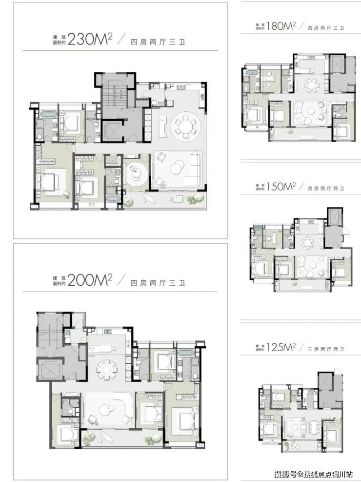 在户型面积段上,项目打造了建面约125、150、180、200、230平米这5个面积段。