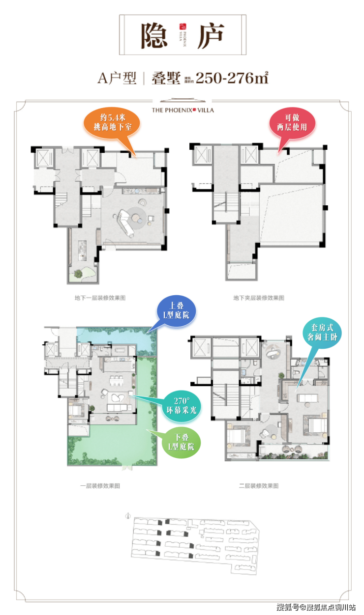 凤鸣雲庐的叠墅,上下叠皆送花园,其中下叠庭院面积达到了约70㎡;上下叠皆配备有约5.4米挑高的地下室,可隔成两层使用。