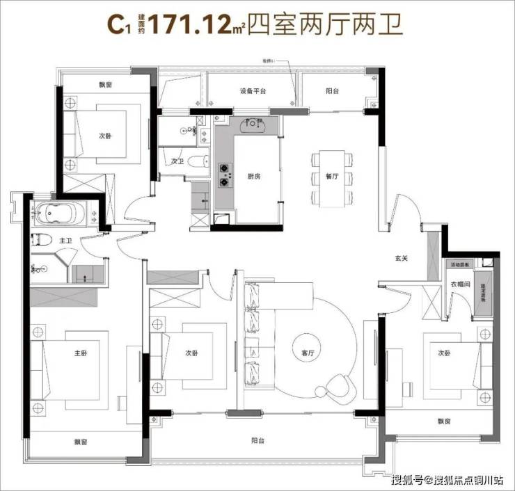 从产品维度看,9#楼建面约171㎡户型,四房两厅两卫的格局,南北双阳台、套房主卧+两个次卧+宽厅全部朝南,是典型的超薄户型。