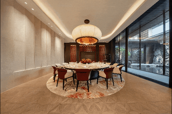 私宴厅直面下沉庭院景观,整面落地玻璃将流水景墙引入室内,中西餐区、备餐间、品茗区、红酒吧、私人棋牌室、KTV影音厅等功能完备,可承办家族私宴或商务雅集,能满足圈层社交的全场景需求。