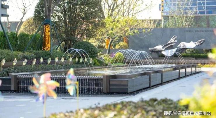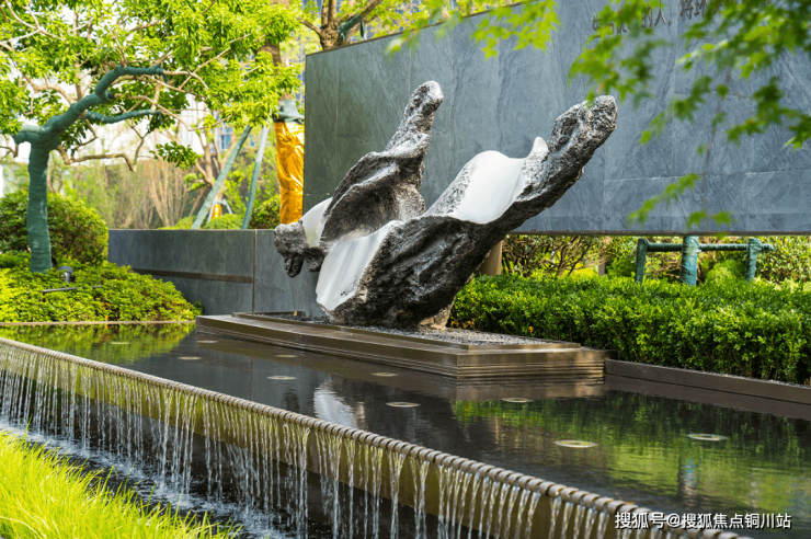景观中轴尽头便是景墙,景墙前主景雕塑立水而居,糙面如山、亮面似水,半城山水永驻;4处灵动水景形态各异,水声潺潺,相映成趣。