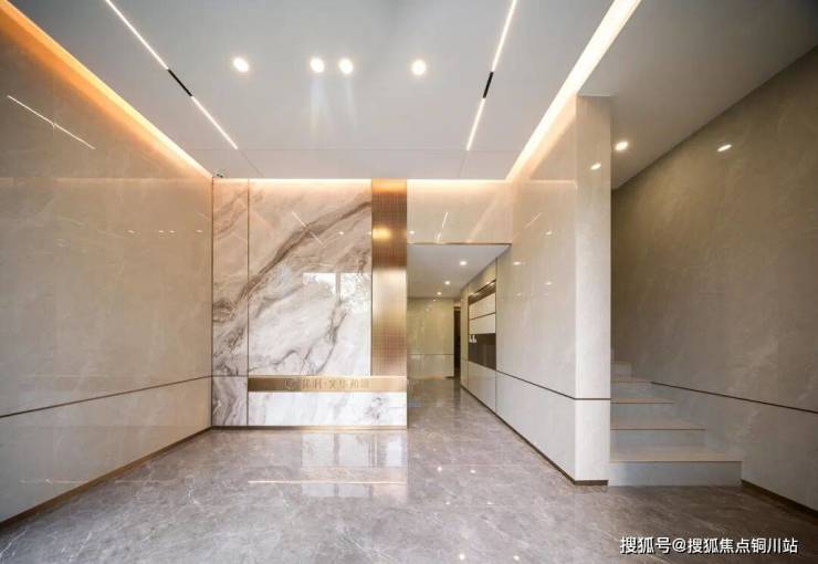双精装入户大堂,地面和墙面全瓷砖铺贴,配合香槟色的金属线条和时下流行的无主灯设计,精致简约。