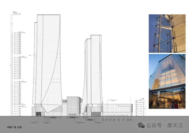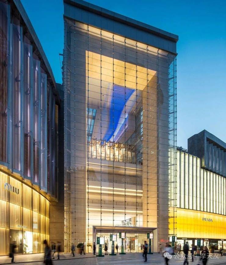 位于三个商场入口的三道玻璃幕墙全部高达四十多米,分别由三百至四百多块玻璃组成。