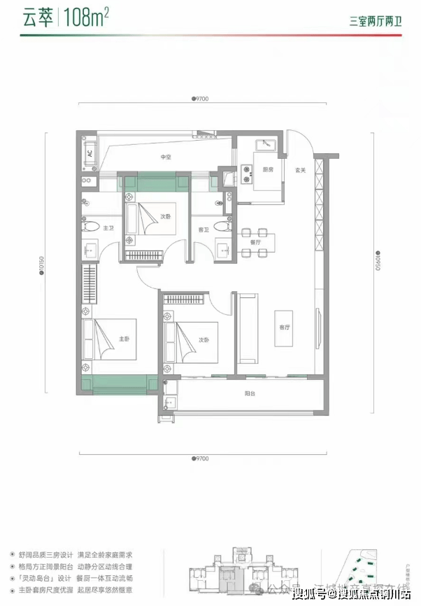 根据户型分布平面图来看,该户型所在楼栋为3梯4户格局,双连廊设计,该户型位于楼栋边户,南北通透,三开间朝南,南向有连接次卧和客厅的大阳台;户型比较方正且动静分区较好,但是过道有点浪费面积,另外根据户型图显示,该户型可以做到一梯一户的居住体验。